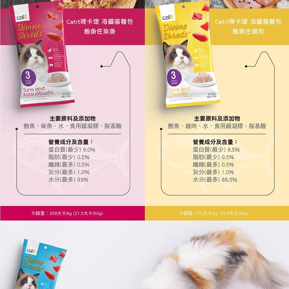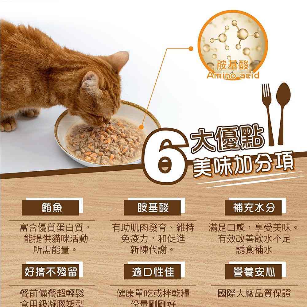 ▼ 生產工廠國際標準認證,品質安全可靠 ▼ 產品特色: 👉🏻 鮪魚富含高品質蛋白質,有助支持貓咪肌肉發展和維持身體機能。 👉🏻 鮪魚富含Omega-3脂肪酸(DHA、EPA)有助維護貓咪皮毛和心臟大腦健康。 👉🏻 鮪魚提供多種維生素礦物質,如維生素B12、維生素D和硒,有助促進代謝和維護骨骼牙齒健康。 👉🏻 柴魚低脂肪易消化,含有豐富蛋白質有助肌肉發展,天然魚香味也有助促進貓咪食欲。 👉🏻 胺基酸有助肌肉發育、維持免疫力和維護心血管健康,並且幫助消化和維持活動所需能量。 主要原料及添加物:鮪魚、柴魚、水、食用級凝膠、胺基酸 營養成分含量:蛋白質(最少) 9.0%、脂肪(最少) 0.5%、纖維(最多) 0.5%、灰分(最多) 1.0%、水分(最多) 89% 卡路里(熱量):358大卡/kg (21.5大卡/60g) 淨重:3入*60g (每袋總計180g) 原產地:泰國 (加拿大品牌)